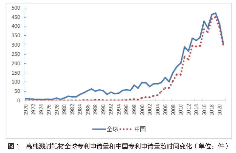 本文主要研究高純濺射靶材全球專利申請狀況及其技術進展,數據檢索選用中國專利文摘數據庫(CNABS)和德溫特世界專利索引數據庫(DWPI)。通過關鍵字和分類號在數據庫中檢索獲得初步結果,通過瀏覽配合分類號去除明顯噪聲。數據檢索截止時間為2021 年12 月31 日。